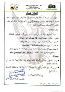 أعلنت مدرسة الصداقة السودانية بالقاهرة، التابعة للمستشارية الثقافية بسفارة جمهورية السودان، عن فتح باب التقديم للتسجيل لامتحان الشهادة الثانوية السودانية للعام 2025م (المؤجلة)، وذلك اعتباراً من يوم الأحد الموافق 11 يناير 2026م بمباني القسم الإداري خلف مدرسة البنين بالدقي