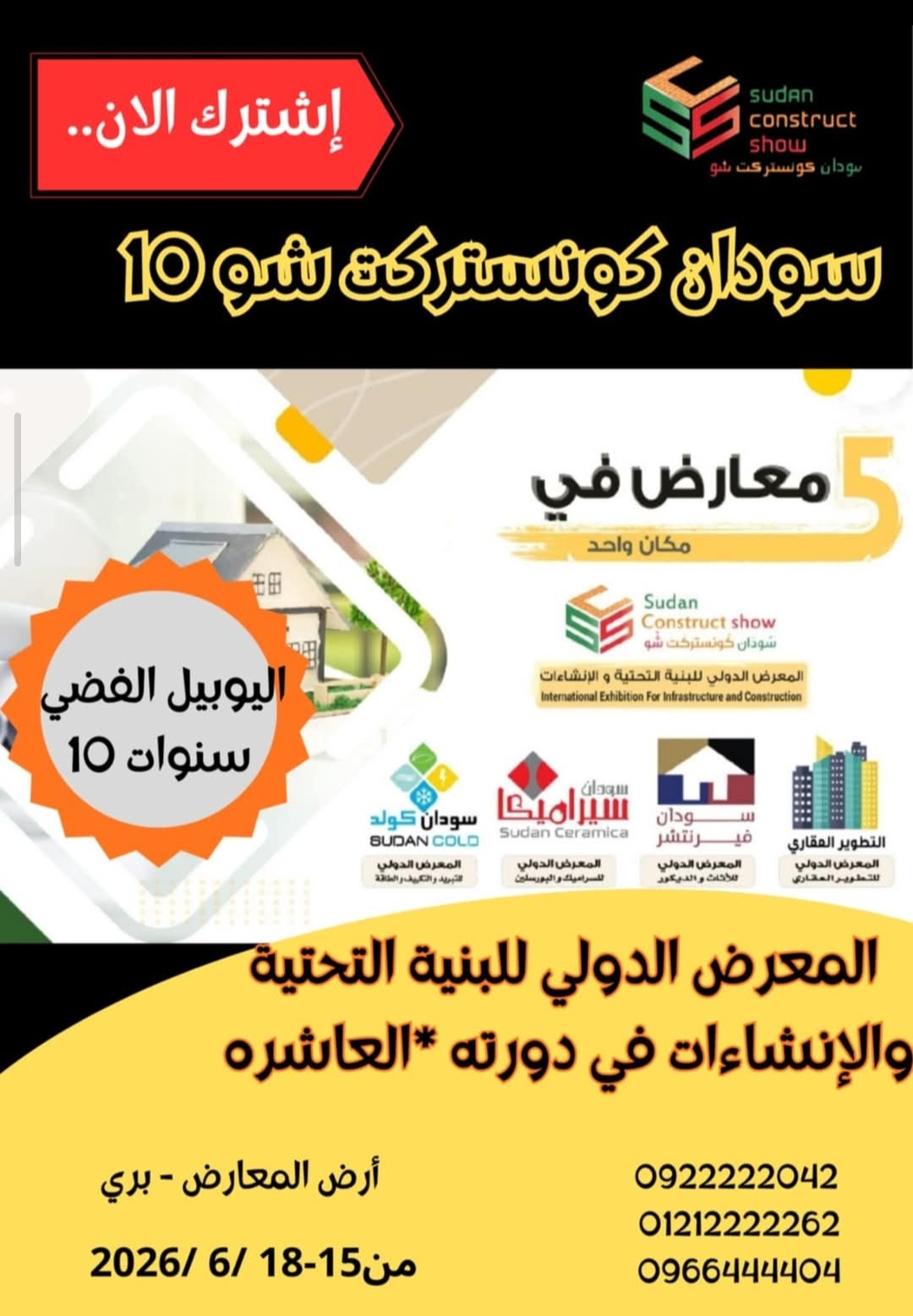 عن بداية الإستعدادات لإنطلاقة المعرض الدولي للبنية التحتية والإنشاءات سودان كونستركت شو في النسخة العاشرة بعد إكتمال كافة الترتيبات الاولية لقيام المعرض في المكان والزمان المحددين في الفترة من 15…18 يونيو 2026 تحت شعار شركاء في البناء والتعمير